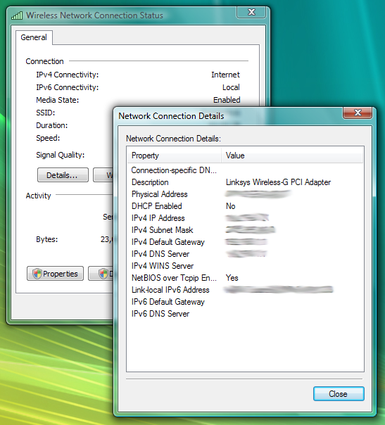 Next, click on ‘View Status’ and then on the ‘Details’ button. This window shows you all the connection details for your active network adapter. You should note down the ‘IPv4 IP Address’. This is your local IP address that you will need to redirect any external traffic to.